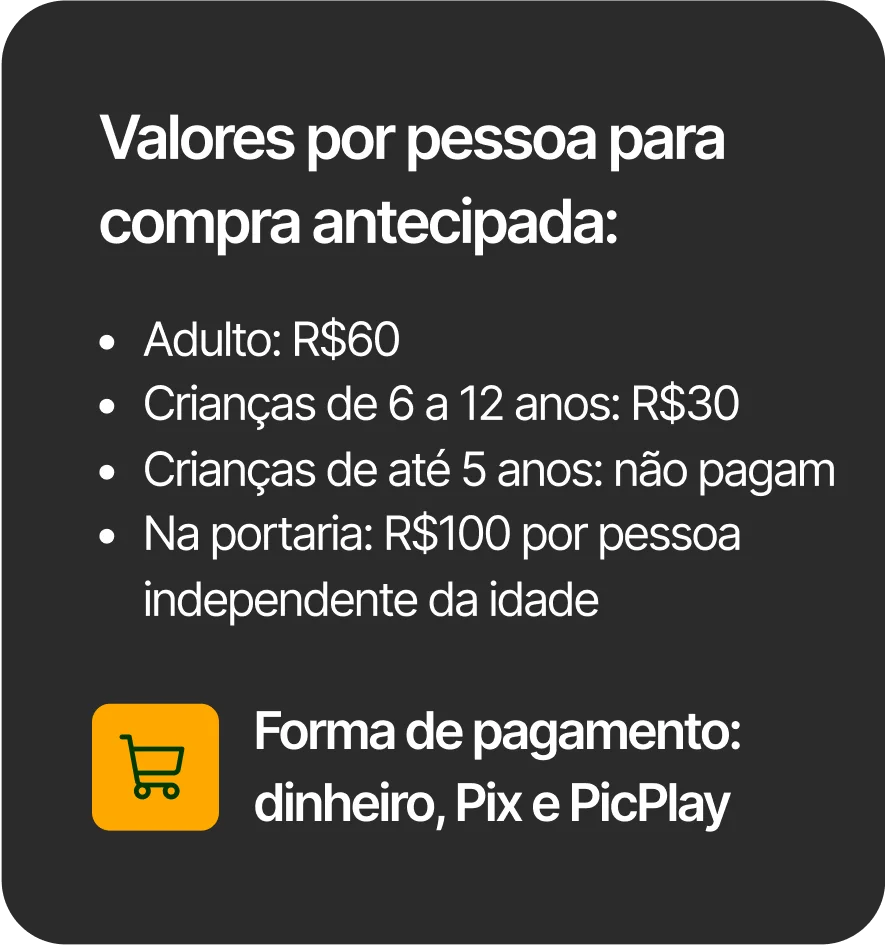 O parque está aberto ao público aos sábados, domingos e feriados nacionais, das 9h às 17h. Ingressos são vendidos exclusivamente pelo WhatsApp.